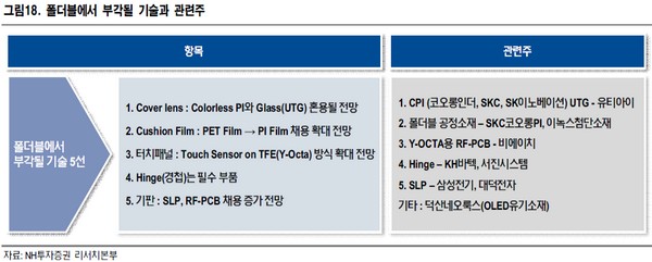 아울러 폴더블 스마트폰 판매 확대로 전반적인 부품사들의 수혜가 기대되나 화면 크기 확대, 쿠션 필름 변화 등 폴더블 스마트폰 기술 변화의 직접적 수혜주인 SKC코오롱PI, 이녹스첨단소재, 비에이치를 유망종목으로 추천했다.