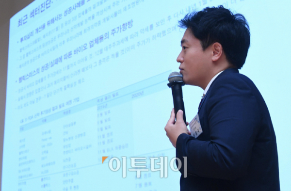 진홍국 한국투자증권 제약·바이오 연구원이 19일 서울 여의도 한국교직원공제회관에서 열린 제9회 프리미엄 투자 세미나 ‘제약·바이오의 미래를 묻다 시즌 3’에서 ‘앞으로는 바뀌게 될 바이오 투자 관행’을 주제로 강연하고 있다. 이투데이미디어가 주최한 이날 행사에선 리서치센터 제약·바이오 담당 연구원들이 직접 코오롱티슈진, 에이치엘비, 신라젠 등 주요 제약 바이오 기업에 대한 평가 진단과 함께 제약·바이오 업종 대표 종목 전망 및 유망 종목 발굴 등을 주제로 강연했다.