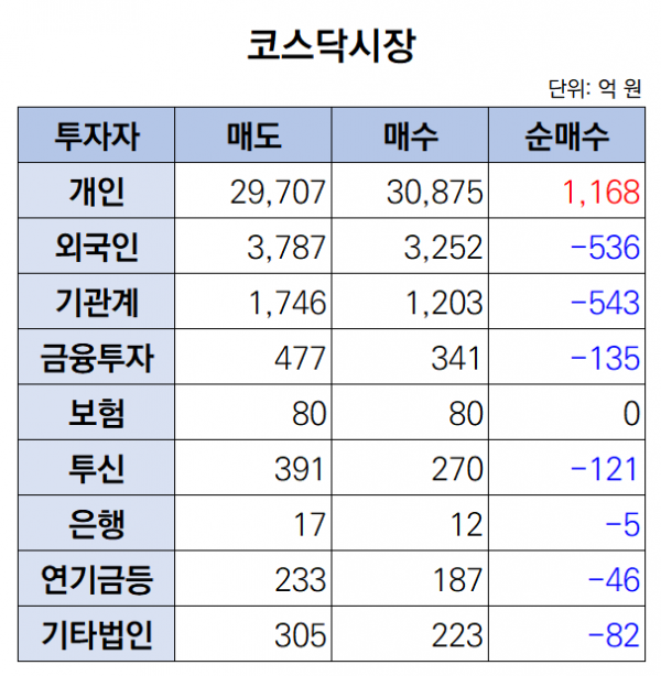 코스닥 621.76p, 하락(▼5.17p, -0.82%)마감. 개인 +1166억, 외국인 -542억, 기관 -543억