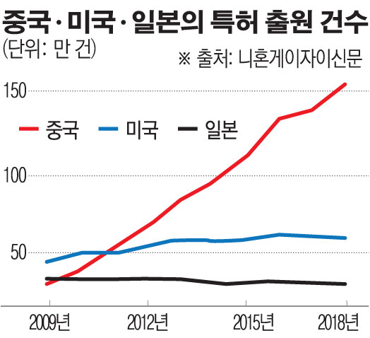 중국의 특허 출원 건수는 전 세계 출원 건수의 약 절반을 차지한다. 인공지능(AI) 등 최첨단 기술의 지식재산 분야에서 중국을 중심으로 아시아가 세계를 견인하는 구도가 더욱 선명해졌다고 닛케이는 풀이했다.