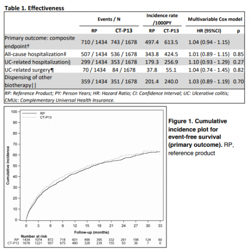 일차종결점의 다변수 분석 결과 램시마는 오리지널의약품과 동등한 결과를 보였다(HR 1.04; 95%CI: 0.94- 1.15). 주요 평가변수가 발생한 군은 오리지널투약군과 램시마군이 각각 710명, 743명으로 나타났는데 각 군 당 507명, 536명이 입원했다. 궤양성 대장염 질환과 관련된 입원은 각각 299명, 353명이었다. 고형암 또는 혈액암이 발생할 위험은 두 제품간의 차이가 관찰되지 않았다(HR 0.81; 95% CI:0.41-1.60).