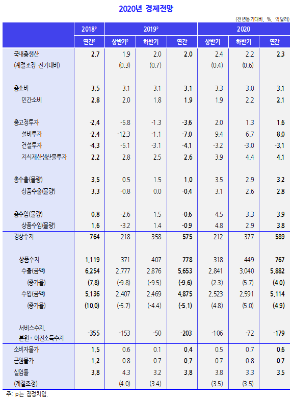 또 “(수출은) 올해 마이너스 요인 중에 가장 큰 게 반도체 단가 하락이었는데, 기저효과가 사라질 것으로 예상된다”며 “수출 수요가 늘어나면 그게 반도체를 중심으로 한 우리 주력 산업의 투자 수요로도 이어질 수 있기 때문에 그 부분도 어느 정도 반영했다”고 부연했다.