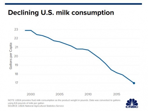 미국의 우유 소비량은 최근 급격히 줄고 있다. 미국 농무부에 따르면 2018년 미국 소비자들이 마신 우유량은 연간 146파운드(약 66kg)로 나타났다. 이는 1975년 관련 통계가 작성된 이후 최저치로 40년간 우유 소비량은 39% 감소했다. 같은 기간 미국 소비자들의 유제품 소비는 20% 증가한 것으로 나타났지만, 우유 대신 요거트나 치즈 등 우유 대체품을 선호한 것으로 파악됐다.