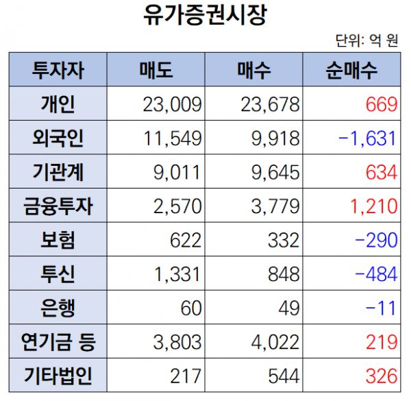 이날 외국인은 홀로 1631억 원 규모의 매물을 출회했다. 반면 개인과 기관은 각각 669억 원, 634억 원을 순매수했다.