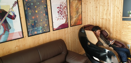 ‘편백나무 쉼터’는 편안하고 아늑한 느낌과 더불어 밝고 화사한 자연의 기운이 가득한 공간으로 연출됐다. 편백나무는 면역력 향상, 불면증과 스트레스 해소 등에 효능이 있다고 알려져 있으며, 편백에서 많이 나오는 피톤치드는 쾌적감은 물론 탈취, 항균 등에 효과적이다. 또 쉼터에는 최고급 안마의자를 설치해 편백의 은은한 자연향과 더불어 편안하게 휴식을 취할 수 있도록 했다.