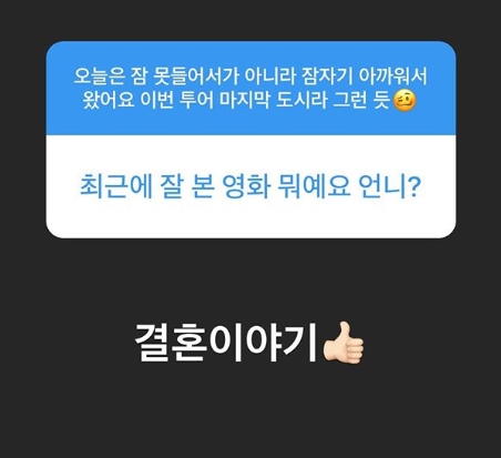 27일 가수 아이유는 인스타그램 스토리를 통해 팬들의 다양한 질문에 대답하는 시간을 가졌다. 이 와중에 한 팬은 "최근에 잘 본 영화가 뭐냐"고 질문했고, 아이유는 "결혼이야기"라고 답했다.