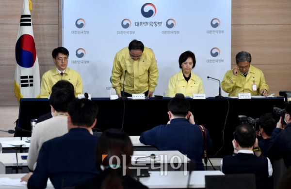 홍남기 부총리 겸 기획재정부 장관이 27일 서울 종로구 정부서울청사에서 마스크 수급 안정관련 브리핑에 앞서 인사하고 있다.