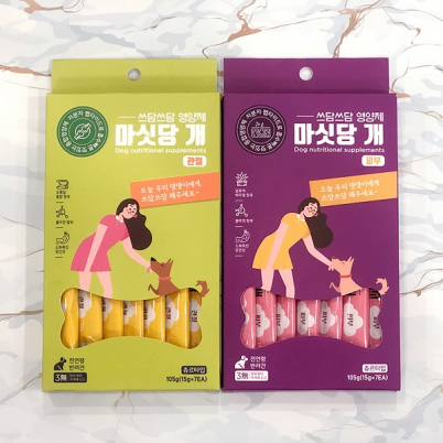 먼저 ‘쓰담쓰담 마싯당 개’는 기능성 관절 영양제와 기능성 피부 영양제, 기능성 눈 영양제, 기능성 장영양제 4종으로 출시됐다. 관절 영양제는 항염과 면역 등에 도움을 주는 초록잎 홍합을 함유했으며, 피부건강 영양제는 피부진정과 항염증 등에 효능을 보이는 알로에베라겔을 함유했다. 눈 영양제는 아로니아와 루테인을 함유하고 있으며, 기능성 장영양제는 소화촉진을 위한 락토바실러스플란타럼과 콜라겐을 함유하고 있다.