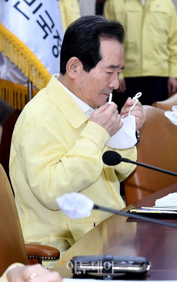 정세균 국무총리가 19일 서울 종로구 정부서울청사에서 열린 신종 코로나바이러스 감염증(코로나19) 대응 중앙재난안전대책본부 회의에서 마스크를 벗고 있다.