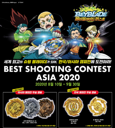 ‘베스트 슈팅 콘테스트’는 세계적인 인기를 누리고 있는 배틀 팽이인 ‘베이블레이드 버스트’를 활용해 아시아 각국에서 동시에 진행되는 글로벌 행사로, 2020년 8월 10일 오후 2시부터 9월 30일까지 만 6세부터 12세 어린이라면 누구나 참여 가능하다.