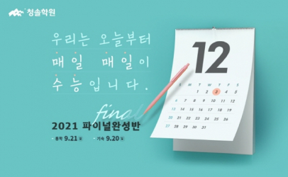 한편, 청솔학원 ‘2021 파이널완성반’은 △강남청솔기숙학원이 9월 20일, △강남/강북/분당/평촌/일산/부천청솔학원은 9월 21일에 개강할 예정이다.