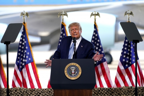 ▲도널드 트럼프 미국 대통령이 18일(현지시간) 애리조나주 유마 국제공항에서 지지자들에게 연설하고 있다. 유마/AP연합뉴스