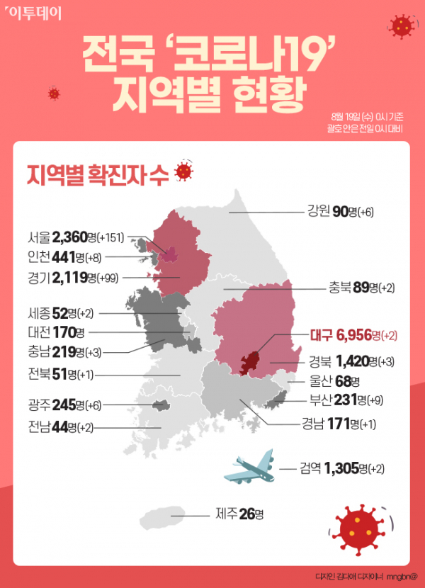 이로써 전국 시·도별 '코로나19' 확진자 수는 △대구 6956명 △서울 2360명으로 가장 많은 비중을 차지했다. 이어 △경기 2119명 △경북 1420명 △검역소 1305명 △인천 441명 △광주 245명 △부산 231명 △충남 219명 △경남 171명 △대전 170명 △강원 90명 △충북 89명 △울산 68명 △세종 52명 △전북 52명 △전남 44명 △제주 26명 순으로 나타났다.