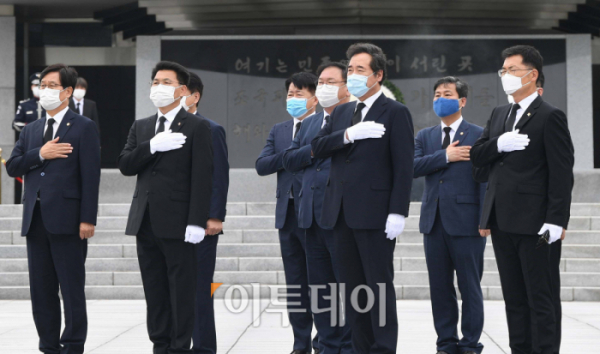 이낙연 신임 더불어민주당 대표를 비롯한 지도부가 31일 서울 동작구 국립서울현충원을 찾아 참배를 마친 뒤 국민의례를 하고 있다.