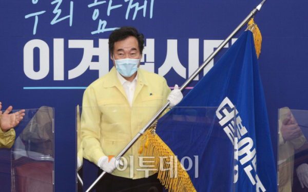 31일 오후 국회 더불어민주당 대표회의실에서 당기전달식이 열린 가운데 이낙연 당대표가 김영주 전국대의원대회 의장에게 당기를 전달 받고 있다.