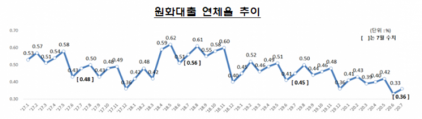 금융감독원은 지난 7월 말 기준 국내 은행의 원화대출 연체율(1개월 이상 원리금 연체)이 0.36%로 전월 말(0.33%)보다 0.03%포인트 상승했다고 10일 밝혔다. 전년 동월말(0.45%) 보단 0.10%p 하락한 수치다.