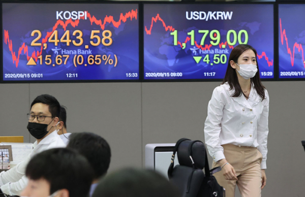 ▲나흘 연속 상승한 코스피가 연고점을 경신한 15일 서울 중구 을지로 하나은행 딜링룸에서 딜러들이 업무를 보고 있다. 이날 코스피는 전날보다 15.67포인트(0.65%) 오른 2,443.58에 장을 마쳤다. (연합뉴스)