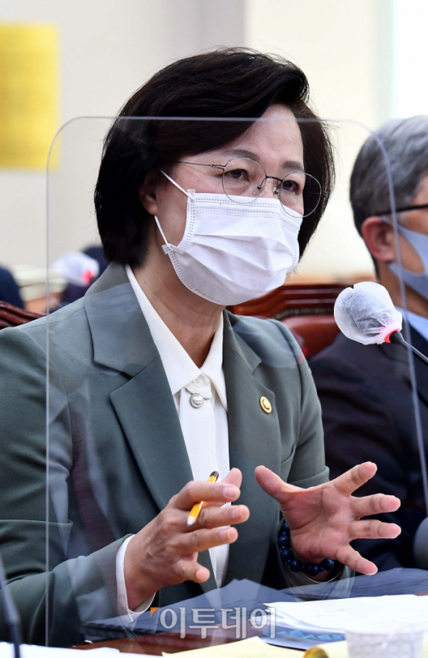 추미애 법무부 장관이 5일 서울 여의도 국회에서 열린 법제사법위원회 전체회의에서 의원 질의에 답하고 있다.
