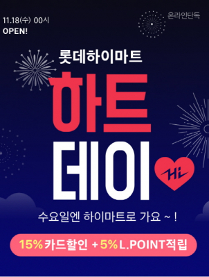 롯데하이마트(대표 황영근) 온라인쇼핑몰이 11월 18일 수요일 ‘하이마트 하트데이’ 행사를 진행한다고 밝혔다. ‘하이마트 하트데이’는 ‘수요일에는 하이마트로 가요’라는 컨셉으로 매주 수요일마다 롯데하이마트온라인쇼핑몰에서만 만날 수 있는 차별화된 특가 상품을 선보일 예정이다. 이번 18일 ‘하트데이’를 시작으로 11월 말까지 매주 수요일마다 진행된다.