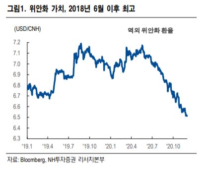 NH투자증권은 10일 역외 위안화 환율은 달러당 6.5위안도 일시적으로 하회해 2018년 6월 이후 최저 수준을 기록 중이라고 밝혔다.