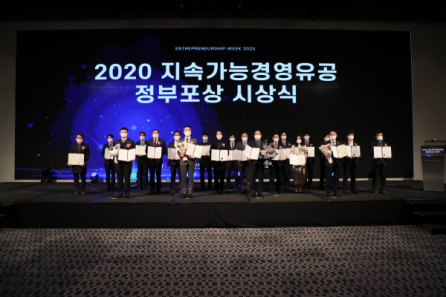 ‘2020 지속가능경영유공 정부포상’은 올해 5월부터 공모를 진행해 한국 ESG평가와 (최종)심의의원회를 거쳐 최종 25개의 수상 기업이 선정되었다. 올해 시상식은 코로나19로 인해 참석자를 대폭 축소하고 온라인과 오프라인 시상식을 병행했다. 참석이 어려운 수상 기업 및 기업의 해외지사 참가자들이 화면으로 함께 해 이목을 끌었다.