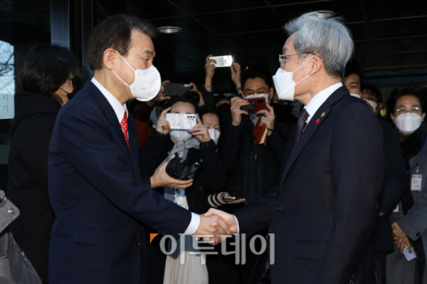 고승범 금융위원장(오른쪽)과 정은보 금융감독원장이 6일 오전 서울 영등포구 여의도 금융감독원에서 신년 회동을 마친 뒤 악수를 나누고 있다.
