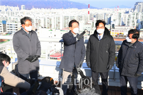 이재명 (왼쪽 두번째) 더불어민주당 대선후보가 13일 오전 서울 노원구 한 빌딩옥상에서 부동산 정책발표에 앞서 주변 노후 아파트 단지 등을 살펴보고 있다. 국회사진취재단