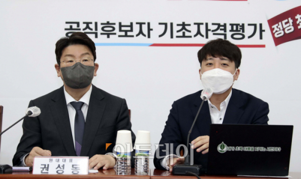 이준석 국민의힘 대표(오른쪽)가 11일 서울 여의도 국회에서 열린 최고위원회의에서 발언하고 있다.
