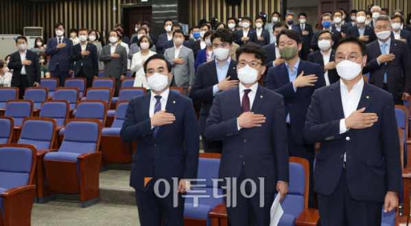 박홍근 더불어민주당 원내대표를 비롯한 의원들이 7일 서울 여의도 국회에서 열린 의원총회에서 국민의례를 하고 있다.