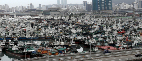 ▲제11호 태풍 '힌남노'가 북상 중인 5일 부산 동구 부산항 5부두에 미리 대피한 선박들이 줄지어 정박하고 있다. (뉴시스)