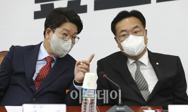 정진석(오른쪽) 국민의힘 비상대책위원장이 14일 서울 여의도 국회에서 열린 비상대책위원회의에서 권성동 원내대표와 대화하고 있다.