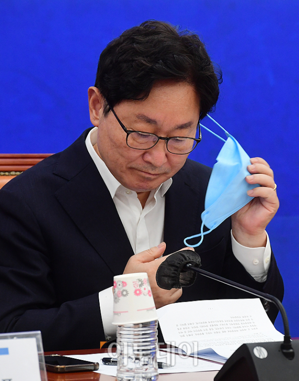 박범계 더불어민주당 윤석열정권 정치탄압대책위원회 위원장이 19일 서울 여의도 국회 원내대표 회의실에서 열린 윤석열정권 정치탄압대책위원회 전체회의에서 마스크를 벗고 있다.