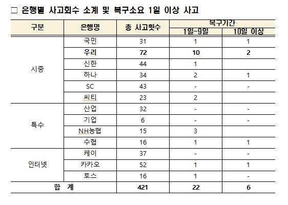 10일 이상 지속된 전자금융사고도 6회에 달했다. 우리은행이 2회, 국민은행, 하나은행, 수협은행, 카카오뱅크가 각각 1회였다.