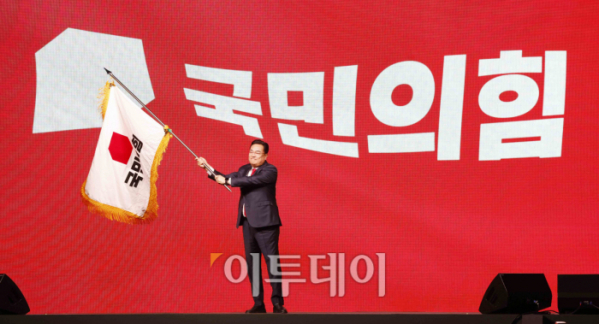 정진석 국민의힘 비상대책위원장이 8일 오후 경기도 고양시 킨텍스에서 열린 국민의힘 제3차 전당대회에서 당기를 흔들고 있다.