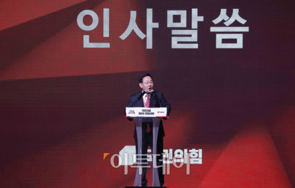 주호영 국민의힘 원내대표가 8일 오후 경기도 고양시 킨텍스에서 열린 국민의힘 제3차 전당대회에서 인사말을 하고 있다.