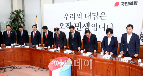 김기현 신임 국민의힘 대표와 지도부가 9일 서울 여의도 국회에서 열린 최고위원회의에 앞서 인사하고 있다.
