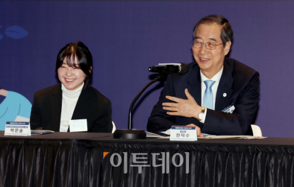 한덕수 국무총리가 17일 경기 성남시 카카오 판교 아지트에서 열린 ‘청년 함께 기업(氣-UP)’ 현장 방문 행사에서 청년과의 대화 시간을 갖고 있다.