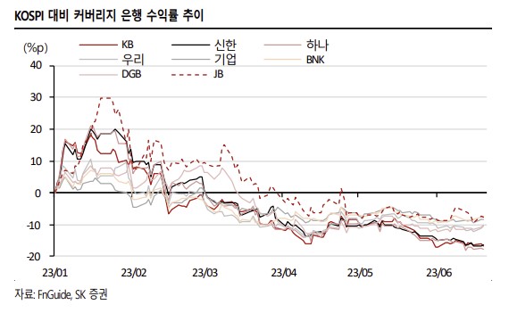 SK증권은 올해 상반기 은행 업종 업황 둔화가 이어지고 있으며, 이를 해소하기 위해서는 본질적인 측면의 불확실성 해소가 필요해 안정성 중심 방어적 접근이 유효할 것이라고 분석했다.