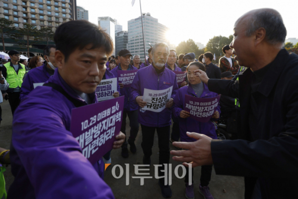 서울광장에 행진을 시작한 이태원 참사 유가족과 시민단체 회원들이 29일 서울 중구 서울광장에 도착하고 있다. 조현호 기자 hyunho@