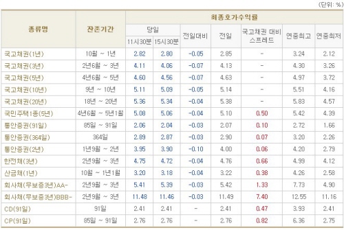 통안증권 1년물은 3bp 하락한 2.87%, 2년물은 10bp 하락한 3.90%로 마감했다. 91일물 CD금리는 전일과 같은 2.41%, 91일물 CP금리도 전일과 동일한 2.76%로 고시됐다.