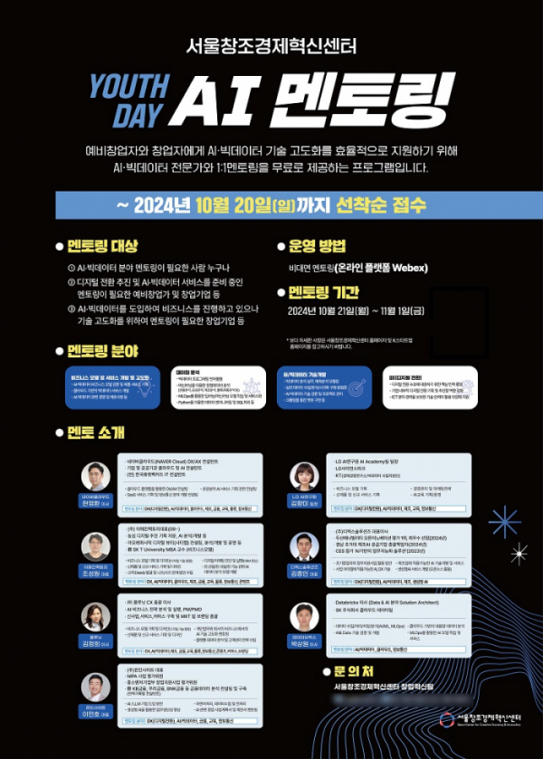 올해 AI멘토링은 10월 21일부터 11월 1일까지 총 2주간 진행될 예정이다. 신청 접수는 10월 20일까지 선착순 마감이며, 매칭이 완료된 멘토와 멘티는 확정된 멘토링 일정에 따라 약 1시간씩 멘토링이 진행된다. 신청 접수 및 상세 내용은 서울창조경제혁신센터, K-startup, 이벤터스 홈페이지를 통해 확인할 수 있다.