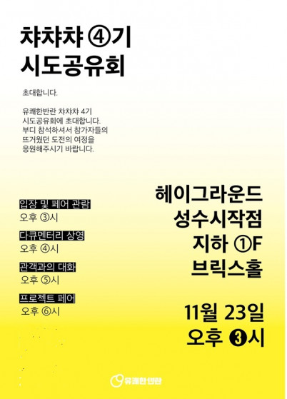 유쾌한반란(이사장 박계신)은 오는 11월 23일 헤이그라운드 성수시작점에서 ‘챠챠챠’(Challenge Chance Change) 4기의 시도공유회를 개최한다고 19일 밝혔다.