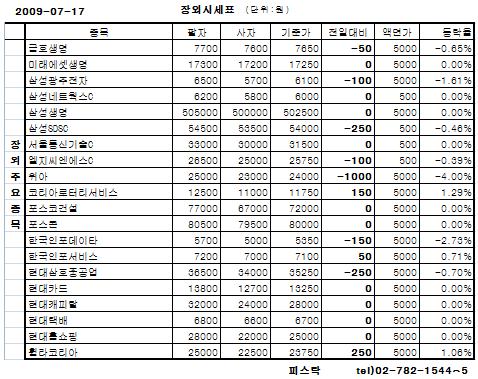 KT계열 전화서비스업자인 한국인포데이타와 한국인포서비스는 서로 등락이 엇갈렸다. 한국인포데이타(5350원)는 2.73% 내린 반면 한국인포서비스는 0.71% 올라 7100원에 안착했다. 포스코건설과 포스콘은 각각 7만2000원, 8만원으로 거래를 마감했다.