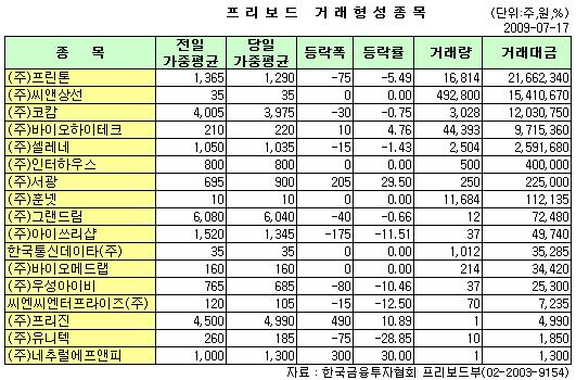 69개 거래가능 종목 중 17개 종목이 거래됐으며 상승과 하락종목은 4개와 8개였다. 바이오하이테크(220원, +10원, 4.76%), 서광(900원, +205원, 29.49%)이 상승한 반면 프린톤(1290원, -75원, -5.49%), 코캄(3975원, -30원, -0.74%) 등은 하락 마감했다.