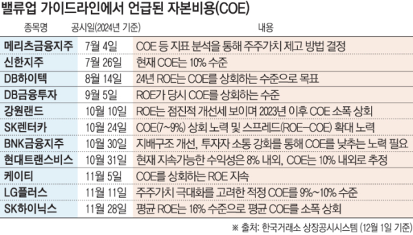 통상 장기적인 기업 가치 제고를 위해서는 자기자본이익률(ROE)과 COE의 균형 있는 고려가 필요하다. ROE가 COE를 지속해서 웃돌면 기업은 주주들에게 요구수익률 이상의 가치를 제공하게 되기 때문이다.