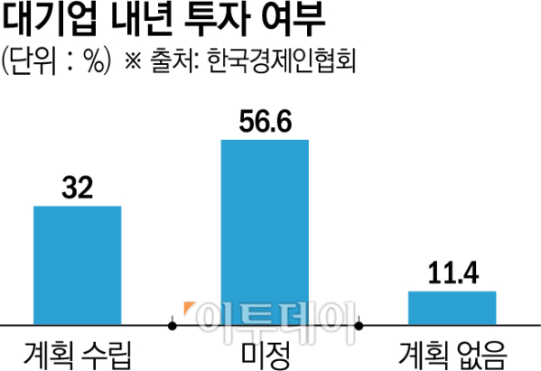 응답 기업의 68.0%는 내년도 투자계획을 아직 수립하지 못했(56.6%)거나 투자계획이 없다(11.4%)고 응답했다. 계획을 수립했다는 응답은 32.0%였다. ‘계획 미정’(56.6%) 기업 비중은 지난해 조사(49.7%) 때보다 6.9%포인트(p) 늘었고 ‘계획 없음’(11.4%)도 6.1%p 늘었다.