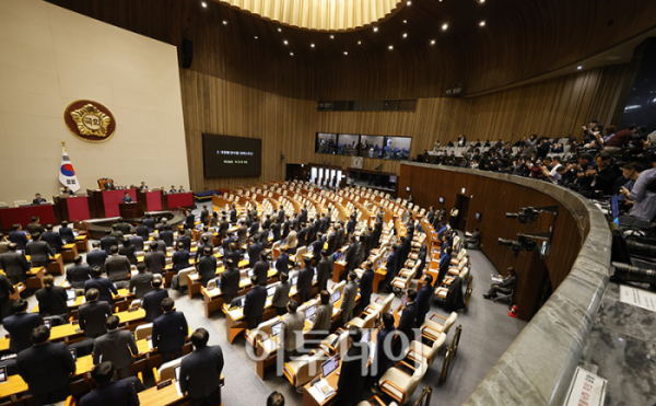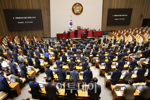 ▲박찬대 더불어민주당 원내대표가 7일 서울 여의도 국회에서 열린 본회의에서 윤석열 대통령 탄핵소추안과 관련해 제안설명을 마치고 민주당 의원들과 함께 국민의힘 의원 이름을 부르며 표결에 참여해줄 것을 호소하고 있다. 고이란 기자 photoeran@