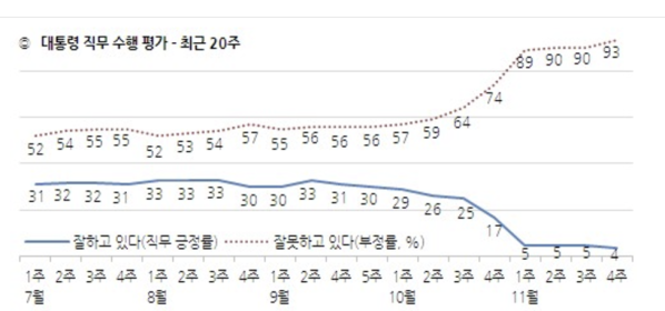 앞서 먼저 이뤄진 한국갤럽의 여론조사(3~5일)에서도 윤 대통령의 지지율은 비상계엄 전후로 뚜렷하게 갈렸다. 계엄 선포 전인 3일 긍정 평가는 19%, 부정은 68% 수준이었지만 계엄 선포와 해제 직후인 4∼5일 조사에선 긍정평가는 13%로 떨어졌고, 부정평가 80%까지 치솟았다. 갤럽 측은 “국정농단 사태 초기인 2016년 10월 넷째 주 박근혜 전 대통령의 대국민 사과 전후 양상과 흡사하다”고 분석했다.
