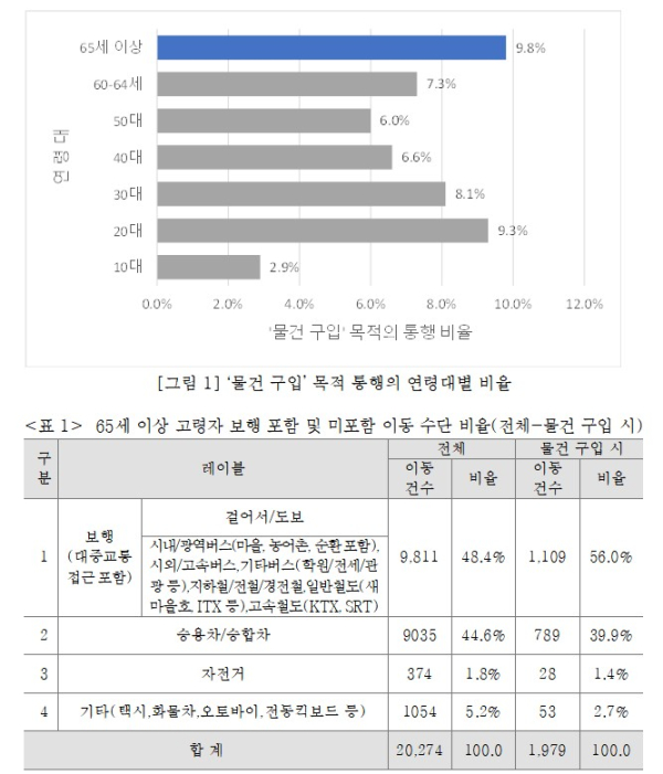 28일 한국교통연구원이 2021년 전국 여객기종점 통행량 조사 중 개인통행실태조사 결과를 활용해 65세 이상 고령자의 이동 목적을 분석한 결과 물건 구매를 위해 도보로 이동하는 비중이 높은 것으로 나타났다.