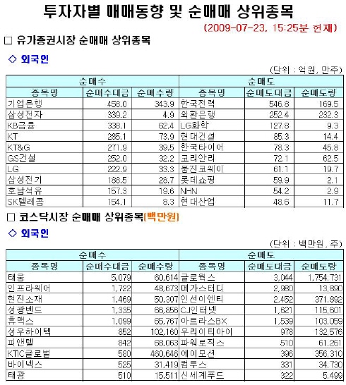 23일 오후 3시 25분 기준 한국거래소의 잠정집계에 따르면 외국인들은 유가증권시장에서 3215억원을 순매수하고 코스닥시장에서는 4억원어치를 팔았다.